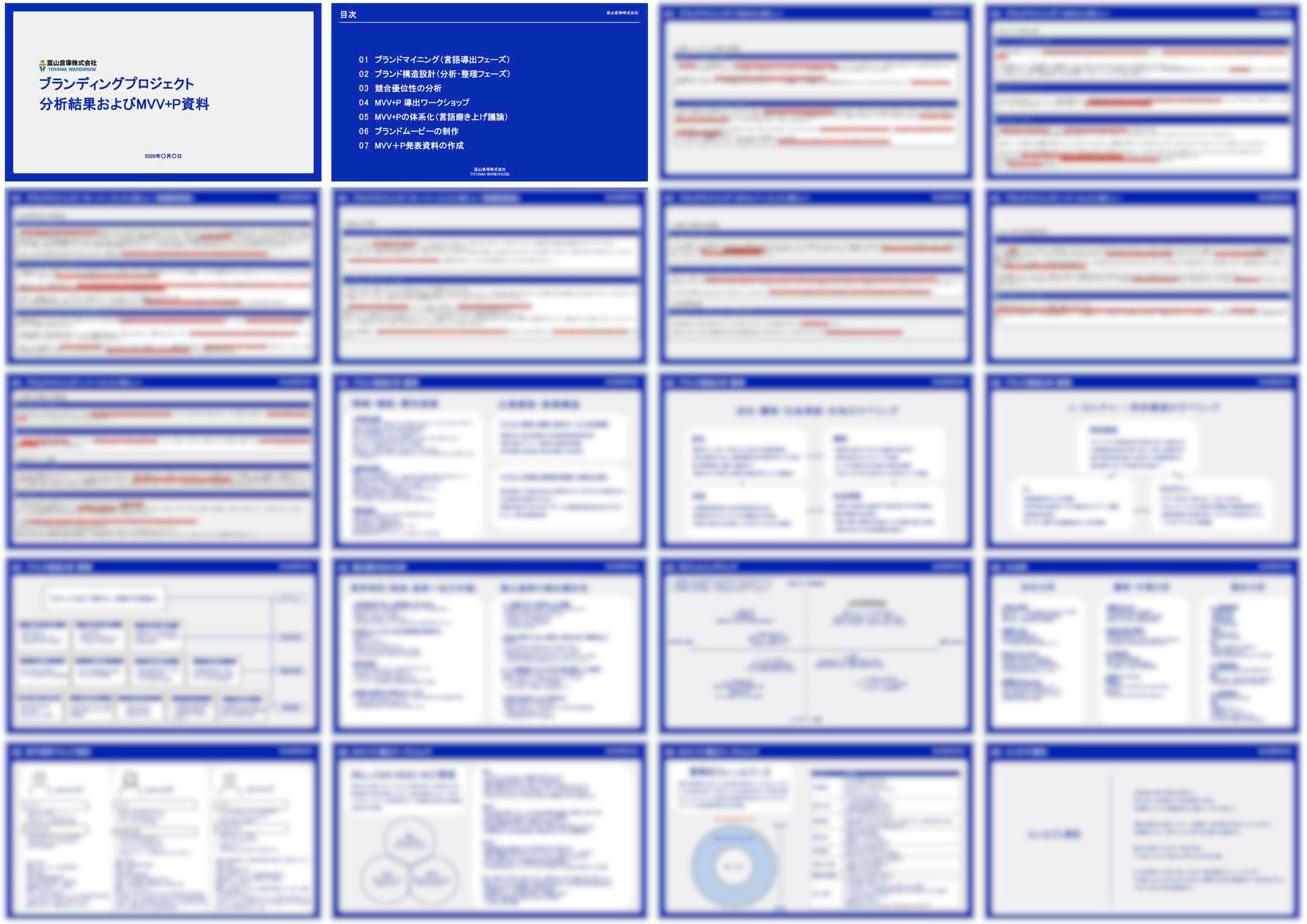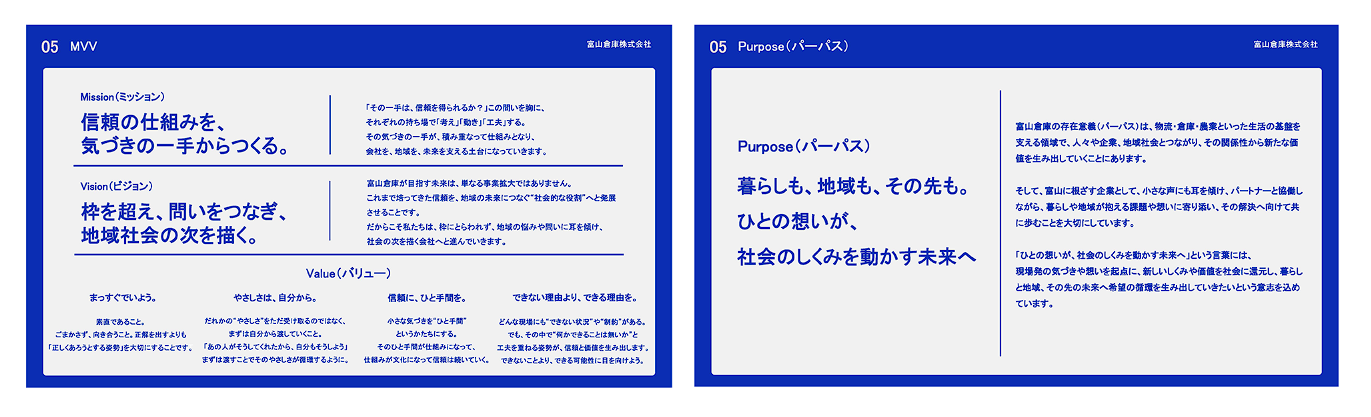 インタビューや言語の構造化で抽出した言葉や考え方を軸に構成し、Purpose・MVVで示した方向性を描いている。社内に向けては共通認識を育てるための映像として、社外に向けては富山倉庫のスタンスを直感的に伝えるための映像として活用できる内容とした。